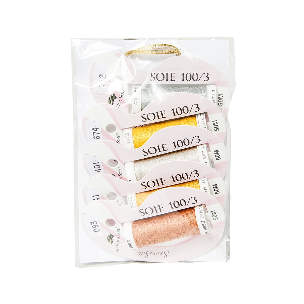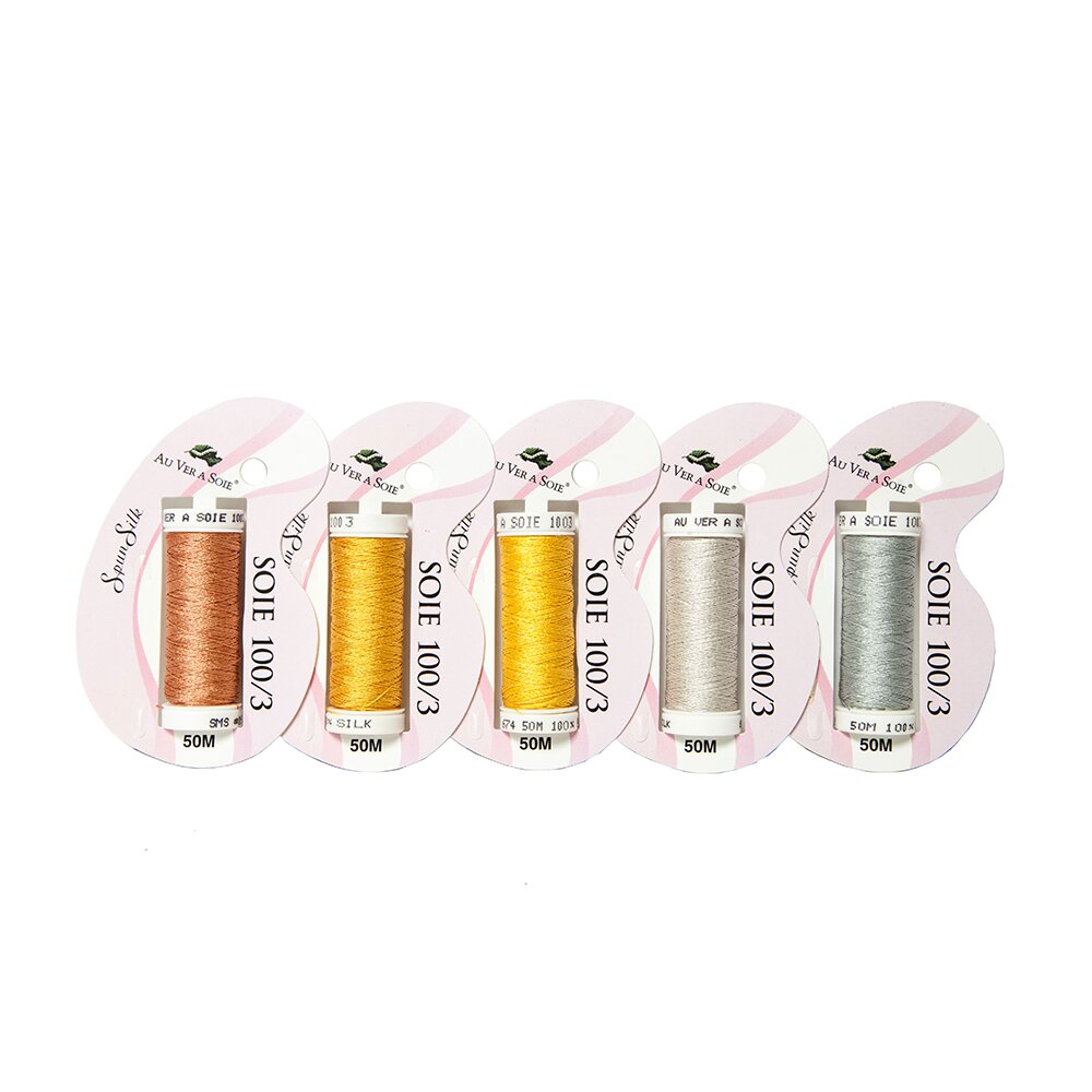A collection of Soie 100/3 silk for couching Real Metal threads. Kit contains 2 colors each of silk and gold, plus one for copper. We recommend using beeswax with this thread.